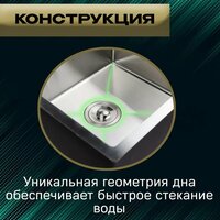 С обратной стороны чаши установлены специальные шумоизоляционные пластины, которые в свою очередь поглощают шум воды из крана, а также не дают скапливаться конденсату. Мойка на кухню нержавейка имеет врезную конструкцию, что позволяет легко встраивать сверху, интегрировать её в столешницу, или подстольного монтажа. Она также оснащена бортиком, который предотвращает переливание воды на поверхность столешницы.