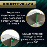 Мойка полностью ручной работы, что определяет ее премиальный сегмент. Сатинированная антикоррозионная поверхность — это богатый внешний вид. Дно сварное, в форме «конверта», корпус обливают шумопоглощающим составом серого цвета.