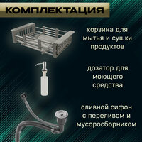 Выпуск-сливная «корзинка» с диаметром снабжена съёмным «ситечком» и крышкой-затвором, которые удобно вынимать для чистки слива. Сифон и гофра в комплекте из первичного пластика. На крыле мойки — логотип SIRIUSLINE. Упаковка — картонная коробка. в комплекте с коландером, врезным дозатором, и сифоном