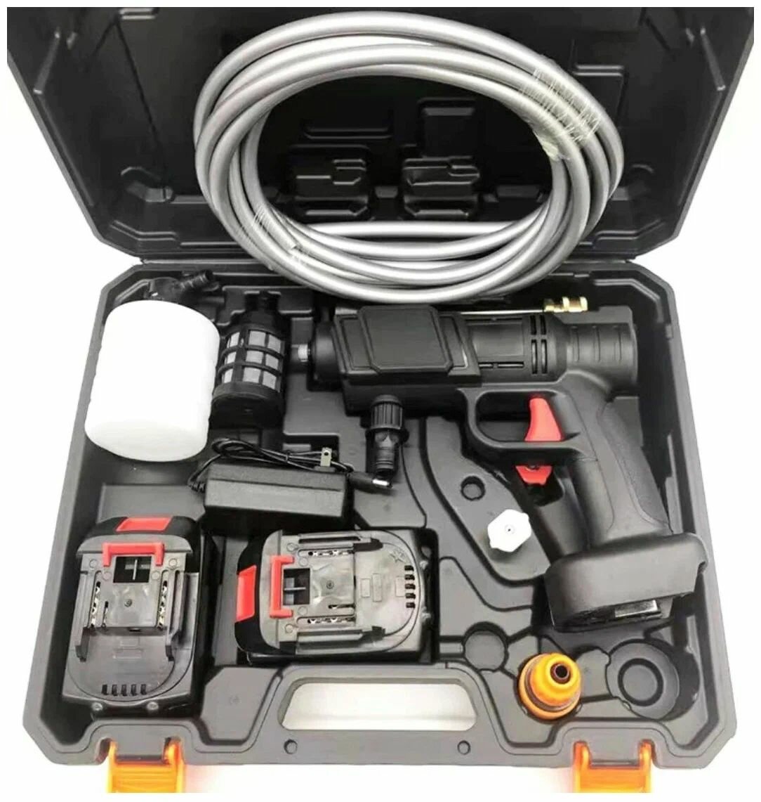 Мойка высокого давления*1 Металлический стержень*1 5м шланг*1 Насадка высокого давления*1 Насадка для вентилятора*1 Быстроразъемный соединитель*1 Зарядное устройство*1 Аккумулятор большой емкости*2 Кейс*1 Руководство пользователя*1 Сетчатый фильтр*1 Кувшин для пены*1