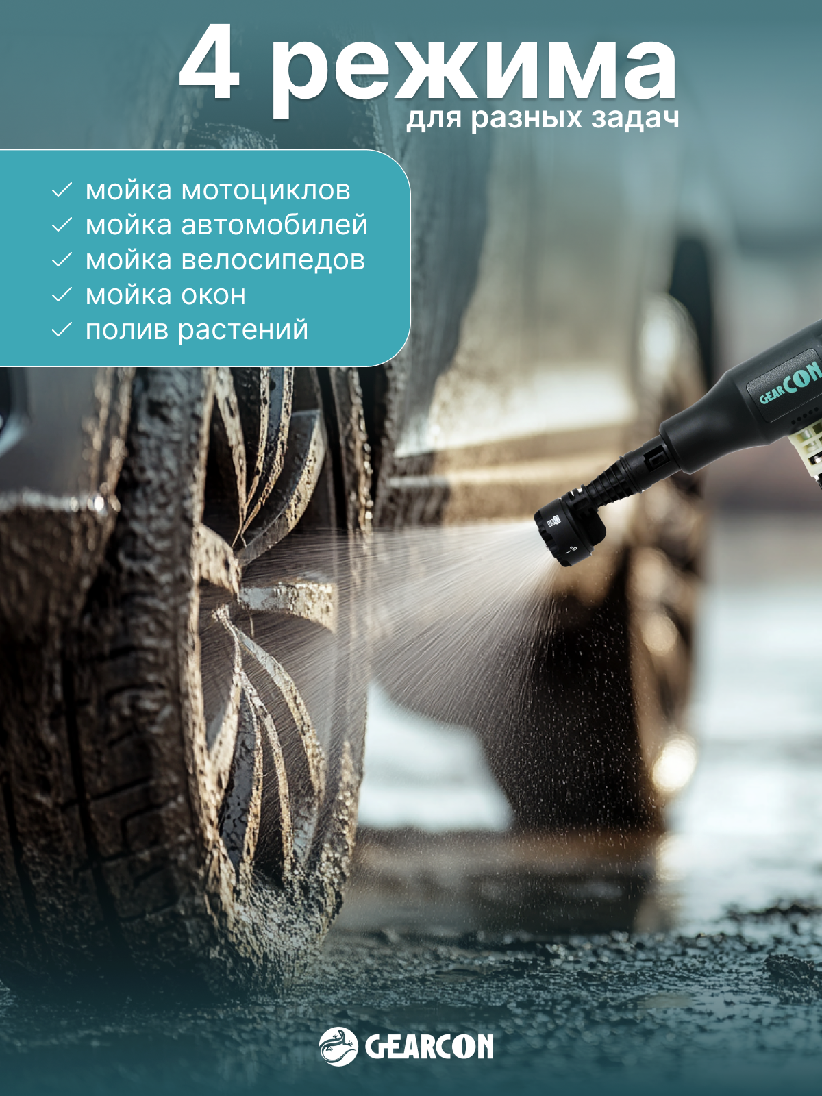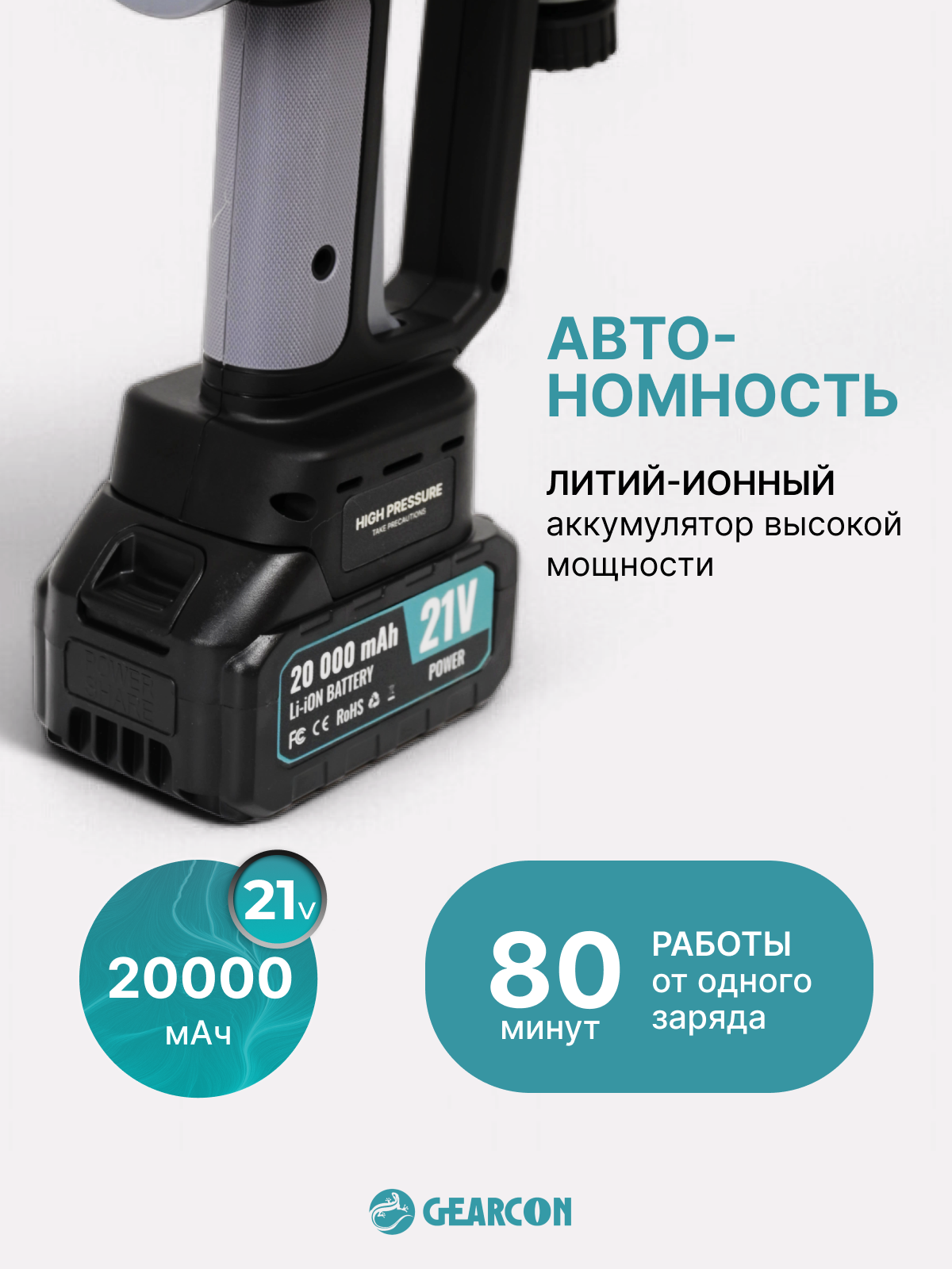 Представляем вам самую мощную и компактную аккумуляторную мойку высокого давления GEARCON, которая станет незаменимым помощником в уходе за вашим домом и автомобилем! С ее помощью вы легко справитесь с любой грязью, будь то застарелые пятна на автомобиле, налет на садовых дорожках или въевшаяся грязь на окнах. Мойка высокого давления GEARCON способна генерировать давление до 250 бар, что позволяет эффективно удалять даже самые стойкие загрязнения. Благодаря встроенному аккумулятору вы можете использовать мойку независимо от источника питания, что делает ее идеальным решением для работы в саду, на даче или вдали от электрических розеток. Встроенный фильтр для воды защитит насос от попадания песка и других частиц, продлевая срок службы мойки. GEARCON – это профессиональная мойка высокого давления, которая станет вашим верным помощником в борьбе за чистоту! С ее помощью вы сможете быстро и эффективно: * Отмыть автомобиль от въевшейся грязи и пыли, придав ему блеск и сияние. * Очистить садовые дорожки от налета и мха, вернув им первоначальный вид. * Удалить грязь и пыль с окон, делая их кристально чистыми. GEARCON – это идеальное сочетание мощности, мобильности и удобства. Забудьте о проблемах с грязью и наслаждайтесь безупречной чистотой! *Емкость указана при параллельном подключении элементов