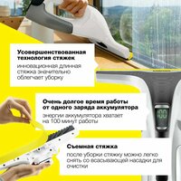 ОсобенностиПередовые периферийные технологии. Инновационная длинная кромка обеспечивает гибкость при очистке — идеально подходит для работы вблизи пола. Увеличенный срок службы батареи. Чрезвычайно длительный срок службы батареи (100 минут) обеспечивает непрерывную уборку. СтеклоочистительСъемный край. Силиконовую кромку можно легко снять с всасывающей насадки и очистить после каждого использования. Быстрое и гигиеничное опорожнение контейнера для грязи. Опорожнение резервуара происходит быстро и легко, без контакта с грязной водой. Очень тихий. Мойщик окон работает очень тихо, что делает его еще более приятным в использовании. Экран, показывающий время автономной работы. Индикатор заряда аккумулятора показывает оставшееся время автономной работы в минутах. Легче планировать уборку. Оригинал. Оригинальное качество и уникальность средств для мытья окон Kärcher. В три раза быстрее. Очистка с помощью средства для мытья окон происходит в три раза быстрее, чем другие традиционные методы мытья окон. Не капает и не оставляет полос. Функция всасывания воды гарантирует, что вода не капает. Сверкающие чистые окна. Подходит для различного использования. Подходит для всех гладких поверхностей, таких как плитка, зеркала, душевые кабины.