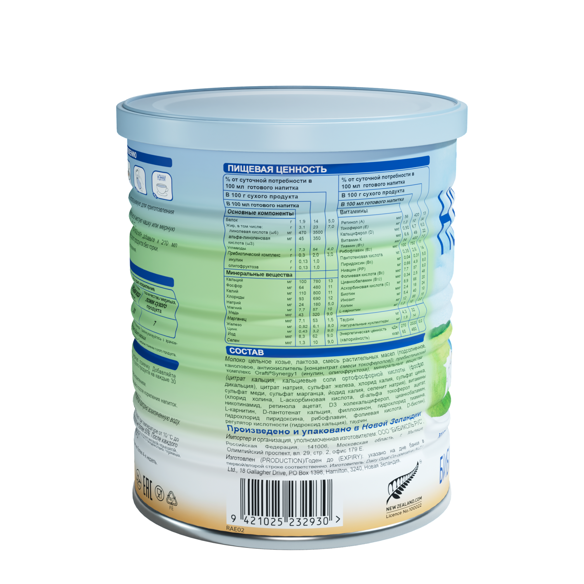 | Состав | Молоко цельное козье сухое*, лактоза, смесь растительных масел (подсолнечное, каноловое, антиокислитель [концентрат смеси токоферолов]), пребиотический комплекс Orafti® Synergy 1 (инулин, олигофруктоза), минеральные вещества (цитрат кальция, кальциевые соли ортофосфорной кислоты (фосфат дикальция), цитрат натрия, сульфат железа, хлорид калия, сульфат цинка, сульфат меди, сульфат марганца, йодид калия, селенит натрия), витамины (хлорид холида, L-аскорбиновая кислота, dl-альфа-токоферола ацетат, никотинамид, ретинола ацетат, D3 холекальциферол, цианкобаламин, L-карнитин, d-пантотенат кальция, филлохинон, гидрохлорид тиамина, гидрохлорид пиридоксина, рибофлавин, фолиевая кислота, D-биотин), регулятор кислотности (гидроксид кальция), таурин. |