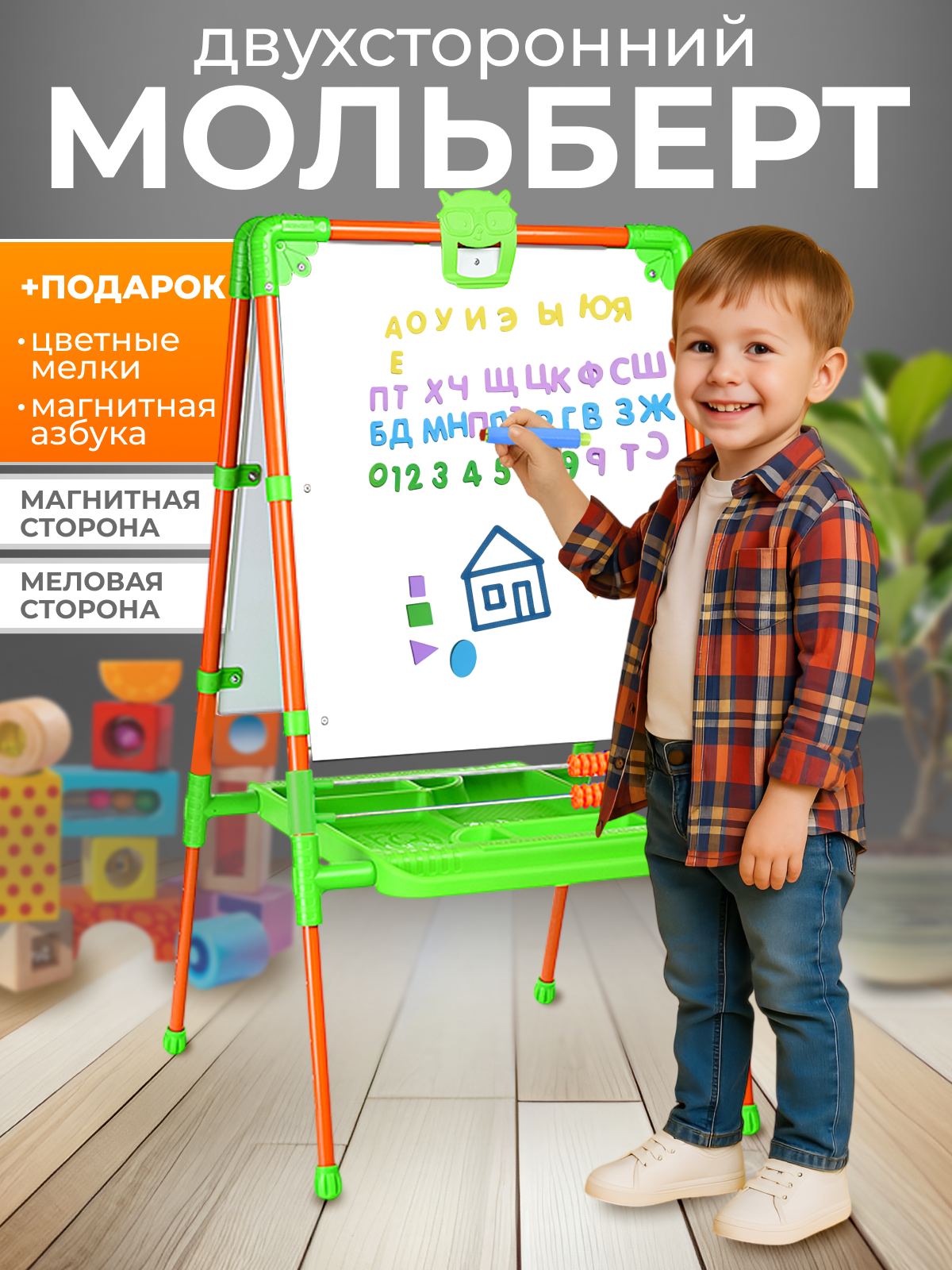 Двусторонний мольберт подходит для детского творчества и развивающих занятий.