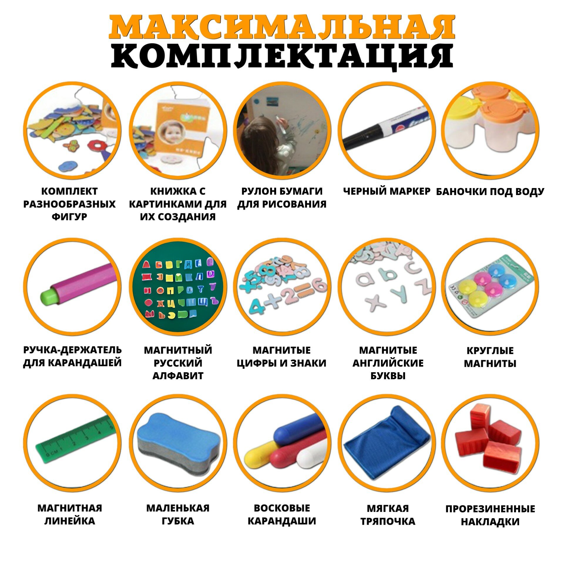 Внимание! Перед использованием необходимо снять защитную пленку с обоих поверхностей! Цвет фурнитуры и аксессуаров в наборе может меняться в зависимости от поставляемой партии и не является браком! разноцветный магнитный русский алфавит 33 буквы. Когда в комнате вашего малыша появится двусторонний деревянный мольберт Floopsi, то все свободное время ребенка будет посвящено только рисованию. Ведь в его распоряжении появятся сразу 2 доски с разным покрытием, а также рулон бумаги для создания рисунков яркими красками. Особенности! Двухсторонний мольберт с рулоном бумаги. Одна сторона для рисования мелками с губкой для стирая непонравившейся картинки. Вторая сторона для рисования маркерами или для магнитов. В верхней части мольберта закреплён рулон бумаги, теперь у ребенка всегда есть возможность порисовать красками. Под досками предусмотрена полочка для размещения аксессуаров и баночек под краску. Мольберт имеет устойчивую конструкцию с нескользящими опорными ножками, а в случае необходимости его можно компактно сложить. Мольберт для рисования Floopsi имеет регулировку высоты от 74 до 120 см, для детей от 2 до 14 лет. Изделие поможет детям проявить свои творческие способности, развивая при этом мелкую моторику рук и координацию движений. Мольберт выполнен из экологичной шлифованной древесины хвойных пород дерева. Многофункциональный поднос устанавливается в двух положениях. Он обеспечивает удобное хранение всех принадлежностей в одном месте и защищает напольное покрытие от попадания краски и водных брызг. Комплектация: рулон бумаги-1шт, баночки под краску с водой-4шт, круглые магниты-6шт, восковые карандаши -4шт, ручка-держатель для карандашей, магнитные английские буквы, магнитные цифры и знаки, черный маркер -1шт, магнитная линейка, комплект разнообразных фигур+книжка с картинками для их создания на доске, маленькая губка, мягкая тряпочка, инструмент для сборки мольберта. прорезиненные накладки на ножки - 4 шт. Размер изделия в собранном виде: 56х120/74 см. Размер рабочей поверхности: 49х43.5см. Размер упаковки: 59х8х72см. Вес мольберта: 6 кг.