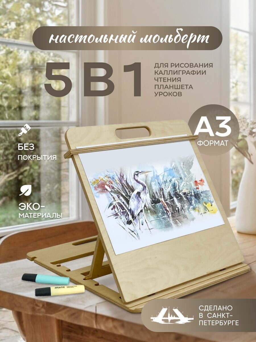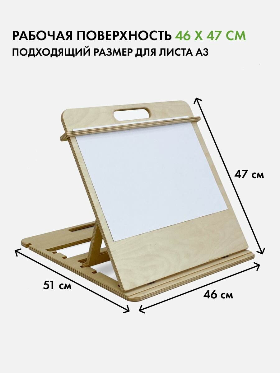 Настольный мольберт планшет А3 — идеальный выбор для начинающих и профессиональных художников, каллиграфов, студентов и всех, кто ценит комфорт и качество в творчестве. Это не только функциональный инструмент, но и прекрасный творческий подарок для детей, школьников или взрослых на день рождения. Изготовленный из премиум - березового листа, мольберт отличается отполированной поверхностью, без покрытия, натуральное дерево. Элегантный деревянный дизайн делает его стильным дополнением к любому рабочему пространству.