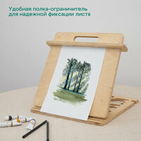Максимальная высота мольберта составляет 56 см, а размеры рабочей поверхности - 33х29,7 см.