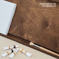 Мольберт выполнен из качественной фанеры и березы, что обеспечивает его устойчивость и надежность. Углы наклона рабочей поверхности составляют 12, 15, 40, 45, 55 и 60 градусов, что позволяет выбрать оптимальный угол для рисования.