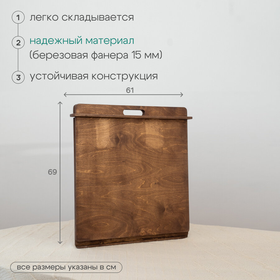В сложенном виде мольберт имеет размеры 61х69 см, что делает его легким и мобильным. Он легко складывается для транспортировки, а также оснащен полкой-ограничителем для удобства хранения художественных принадлежностей.