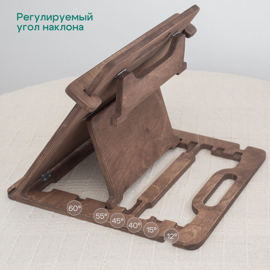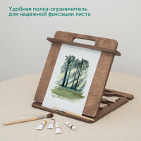 Мольберт выполнен из качественной фанеры и березы, что обеспечивает его устойчивость и надежность. Углы наклона рабочей поверхности составляют 12, 15, 40, 45, 55 и 60 градусов, что позволяет выбрать оптимальный угол для рисования.