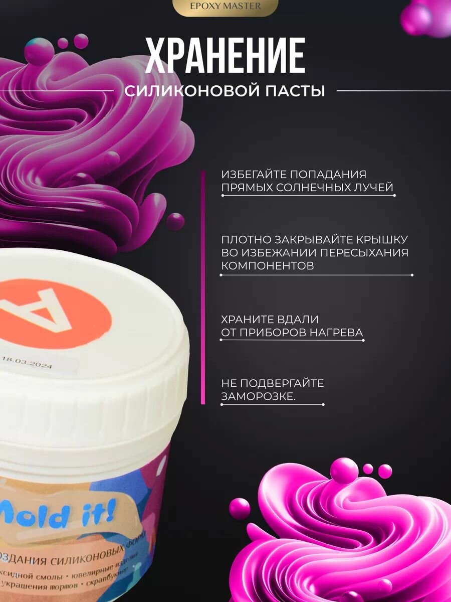 Хранение: храните силикон с плотно закрытой крышкой во избежание пересыхания компонентов. Храните вдали от приборов нагрева, избегайте попадания прямых солнечных лучей. Не подвергайте заморозке.