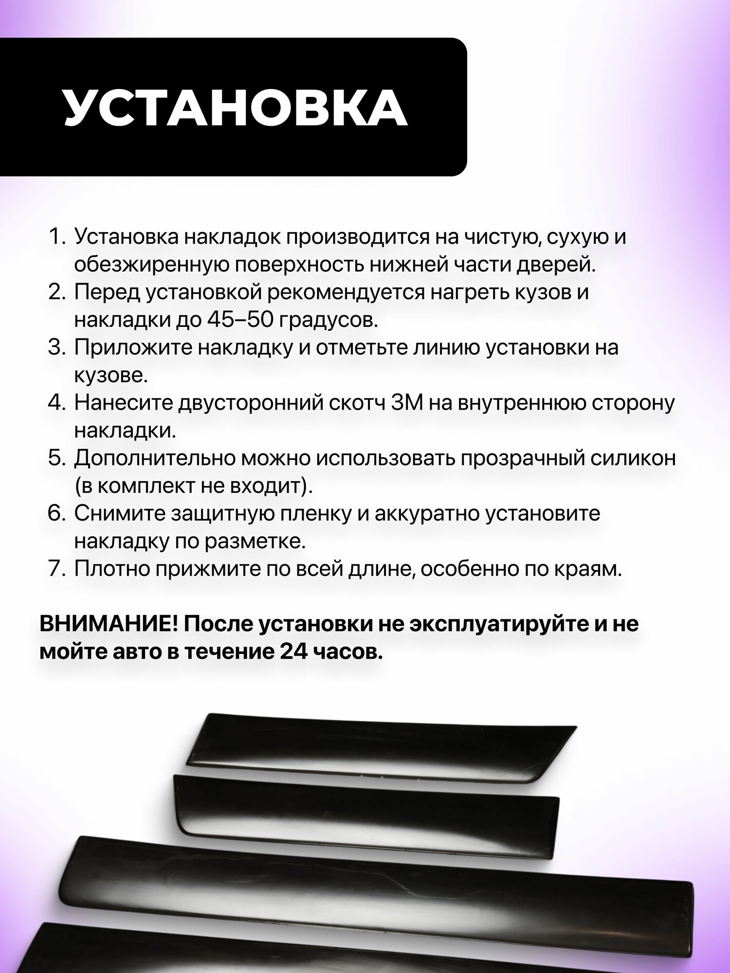 - Установка занимает 15–20 минут: крепятся на: двухсторонний скотч 3М, прозрачный силикон