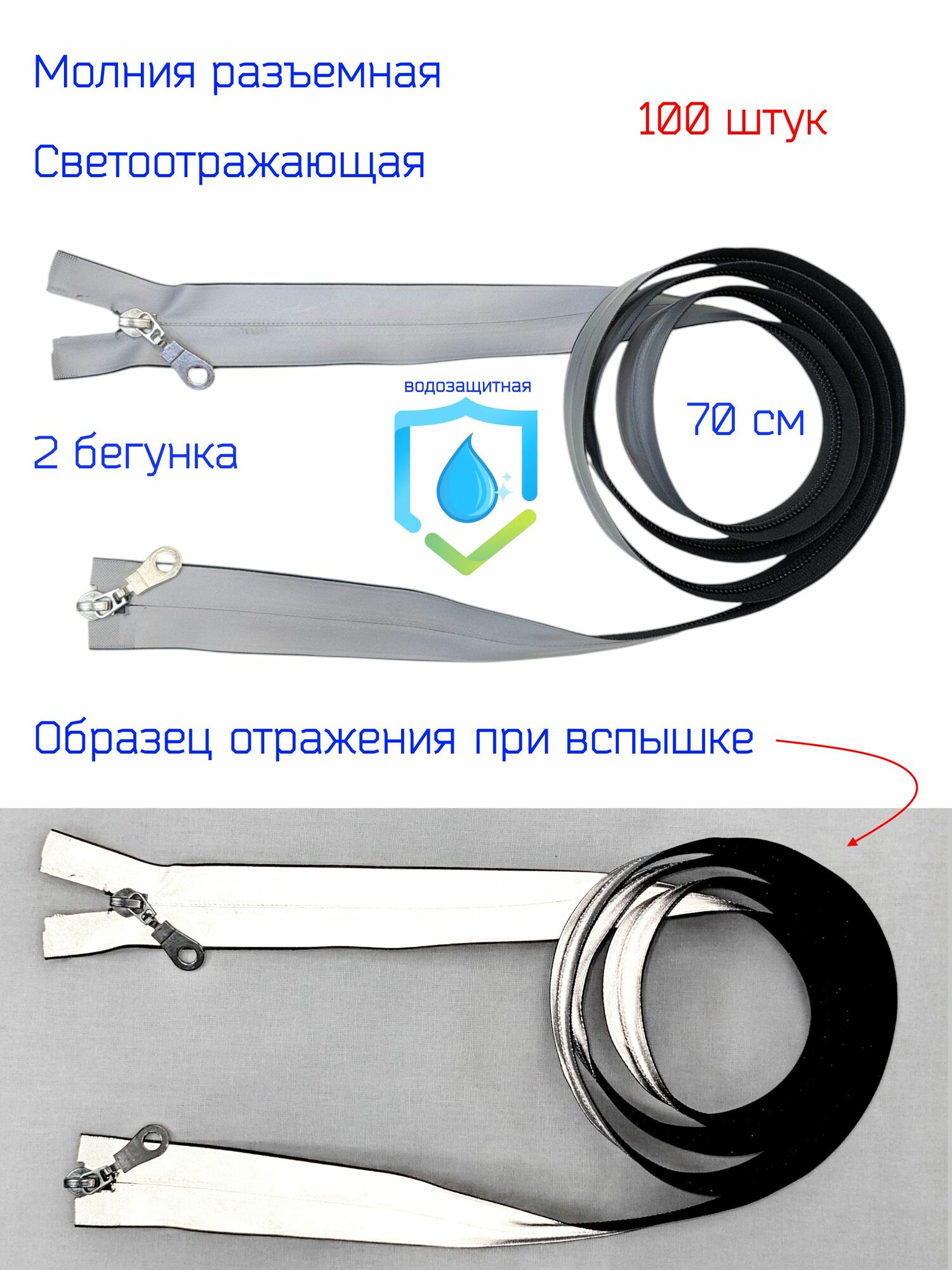 Молния разъёмная, водонепроницаемая и светоотражающая с 2 бегунками для расстёгивания сверху и снизу.