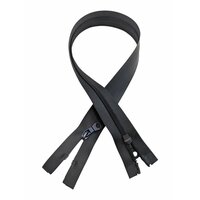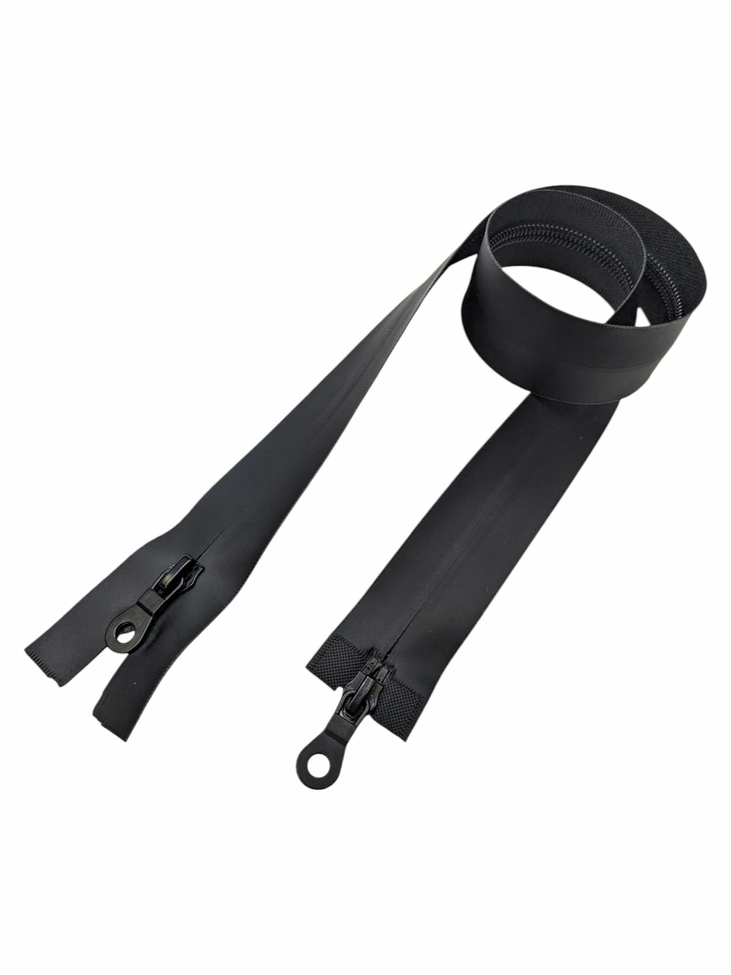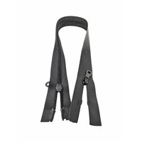 Молния разъёмная, водонепроницаемая, длиной 50 сантиметров черного цвета с 2-мя бегунками в цвет молнии. Не допускает попадания воды внутрь одежды и аксессуаров защищая от влаги. Зубцы молнии направлены внутрь, благодаря чему влага скатывается по внешней стороне.
