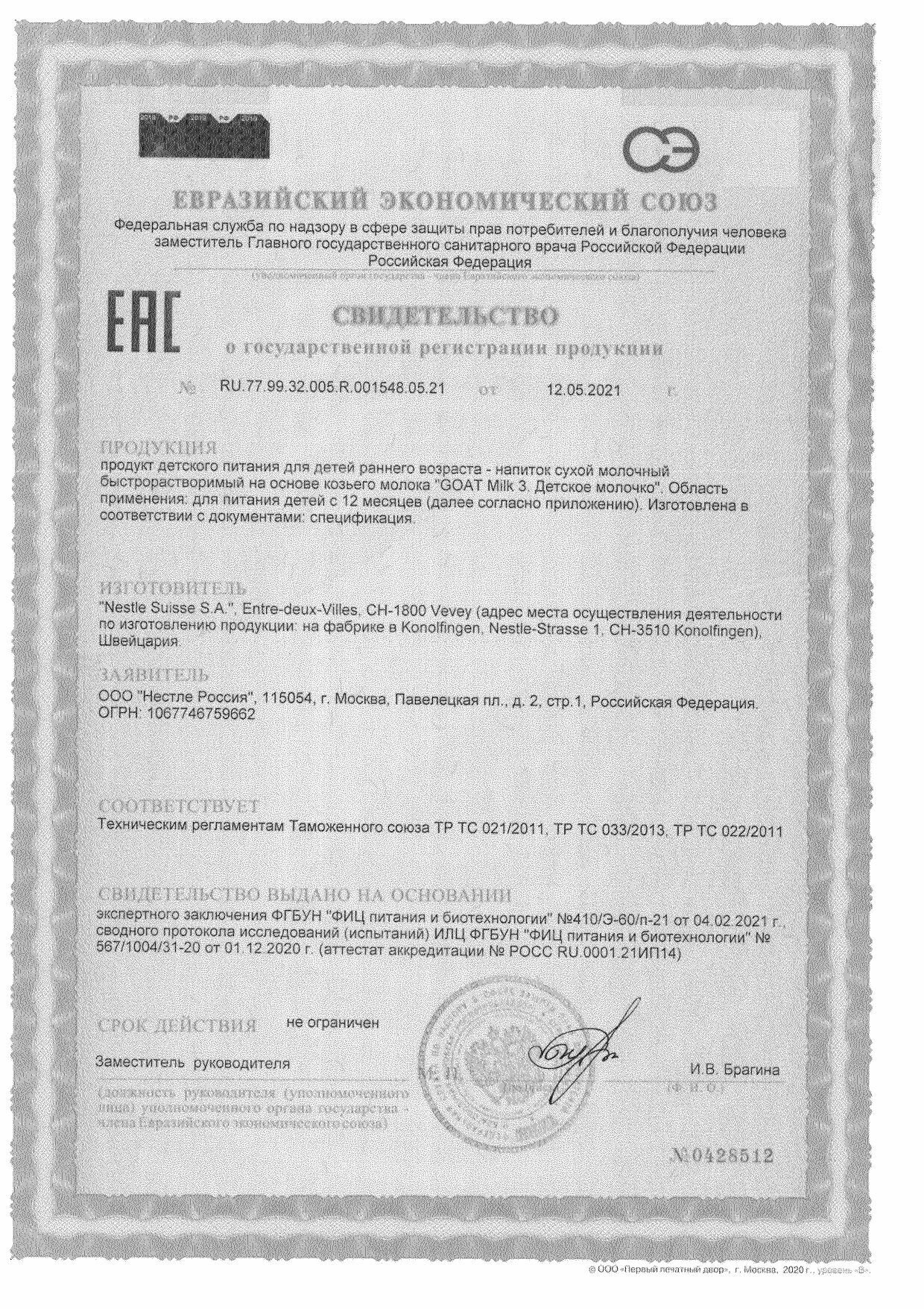 Состав: сыворотка сухая деминерализованная из козьего молока, молоко козье цельное сухое, смесь растительных масел (рапсовое низкоэруковое, подсолнечное, подсолнечное высокоолеиновое, кокосовое), лактоза, масляная смесь с DHA (подсолнечное масло, рыбий жир), кальциевая соль ортофосфорной кислоты (фосфат кальция), эмульгатор соевый лецитин, цитрат натрия, смесь витаминов (ретинола ацетат (А), D3 холекальциферол (D), L-аскорбат натрия (С), тиамина мононитрат (В1), никотинамид (PP), пиридоксин гидрохлорид (В6), фолиевая кислота, цианкобаламин (В12)), минеральный премикс (сульфат железа, сульфат цинка, сульфат меди), лактобактерии L. Reuteri (не менее 1х106 КОЕ/г), регулятор кислотности гидроксид натрия, нуклеотиды. Упаковано в модифицированной атмосфере с азотом.