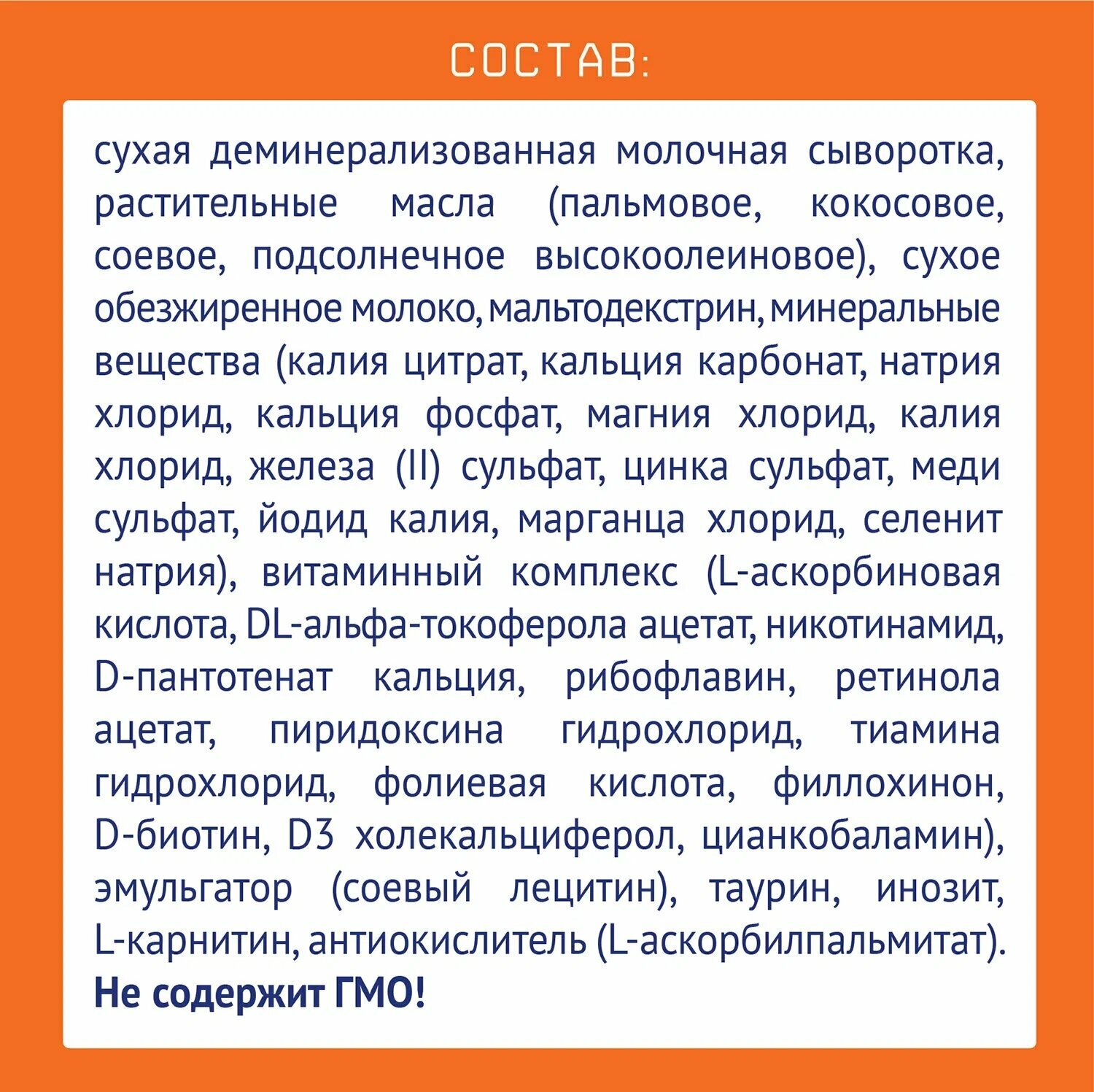 Сухая деминерализованная молочная сыворотка, мальтодекстрин, растительные масла (подсолнечное высокоолеиновое, соевое, кокосовое), сухое цельное молоко, сухое обезжиренное молоко, концентрат белков молочной сыворотки, минеральные вещества (калия цитрат, кальция карбонат, кальция фосфат, натрия хлорид, магния хлорид, калия хлорид, железа (II) сульфат, цинка сульфат, меди сульфат, марганца хлорид, йодид калия, селенит натрия), молочный жир, рыбий жир (источник докозагексаеновой кислоты DHA), витаминный комплекс (L-аскорбиновая кислота, DL-альфа-токоферола ацетат, никотинамид, D-пантотенат кальция, рибофлавин, ретинола ацетат, пиридоксин гидрохлорид, тиамина гидрохлорид, фолиевая кислота, филлохинон, D-биотин, D3 холекальциферол, цианкобаламин), олигосахарид 2’-фукозиллактоза, холина битартрат, инозит, таурин, эмульгатор (соевый лецитин), нуклеотиды (цитидин-5’-монофосфорная кислота, уридин-5’- монофосфат динатриевая соль, аденозин-5’-монофосфорная кислота, гуанозин-5’-монофосфат динатриевая соль, инозин-5’-монофосфат динатриевая соль), масло Mortierella Alpina (источник арахидоновой кислоты ARA), L-карнитин, антиокислитель (аскорбилпальмитат), лютеин.
