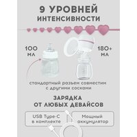 Молокоотсос электрический беспроводной - это лучшее решение для быстрого и безболезненного сбора молока! Очень многие из наших покупателей отмечают, что у них наладилась лактация и сильно прибавилось молока после использования данного аксессуара для кормления. Никаких неудобных проводов и трубок! Очень компактный, вы всегда можете взять его с собой и использовать в любом месте, на прогулке или в машине. Мощный мотор работает от емкого встроенного литиевого аккумулятора 1200 мАч (до 2,5 часов непрерывной работы), заряжается от всех возможных источников питания через USB кабель на Type C. Молокосос имеет не 2, а 3 фазы работы: Массаж, Сцеживание и Смешанный режим для самой чувствительной груди. Каждый режим работы имеет по 9 уровней интенсивности. Вы без труда найдете самый комфортный. За счет функции массажа и полной имитации сосательных движений ребенка, процесс сцеживания происходит быстро и безболезненно. Отлично подойдет для профилактики и предотвращения лактостаза. Воронка с силиконовой окантовкой отлично прилегает к груди, создавая безупречный вакуум, имеет универсальный угол охвата и подойдет для всех размеров груди. Молокоотсос имеет удобный сенсорный блок управления с подсветкой, индикатором заряда, таймером и функцией памяти выбранных ранее настроек. Работает тихо (50 дцб), что позволяет использовать его в любое время суток даже когда рядом спит малыш. Минимум деталей, очень легко разбирать, собирать и мыть. Молокоотсос выполнен из самых современных и безопасных материалов. Никакого неприятного запаха от пластика. Не содержит Бисфенол А. В комплекте бутылочка 180мл из чистейшего пластика PP со стандартным разъемом, которая подходит к большинству известных брендов, таких как Avent, Medela и другие, соска из пищевого силикона, кабель USB-Type C, инструкция на русском, дополнительный клапан, гарантийный талон. Доставляется в доп. транспортной коробке. Гарантия 1 год, при поломке вам даже не нужно никуда идти, мы доставим вам новый прибор.