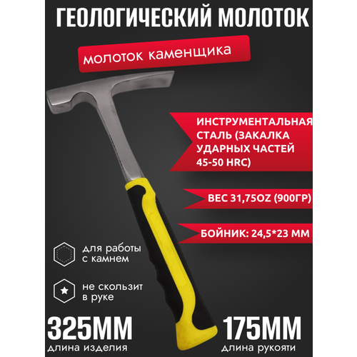 ✔ Вес: 900 г (31,75 oz) – оптимальный баланс между ударной силой и удобством работы. ✔ Общая длина: 325 мм – компактный и удобный для транспортировки. ✔ Длина рукоятки: 175 мм – эргономичный хват для точных ударов. ✔ Бойник: 24,5 × 23 мм – усиленная ударная часть для дробления пород и работы с камнем. ✔ Материал: Инструментальная сталь с закалкой рабочих поверхностей до 45-50 HRC – высокая прочность и износостойкость.