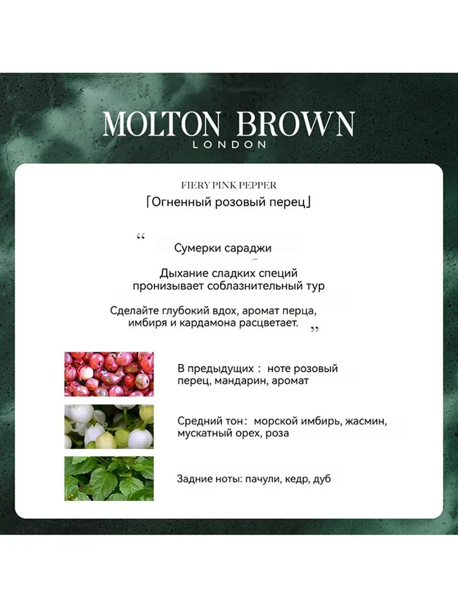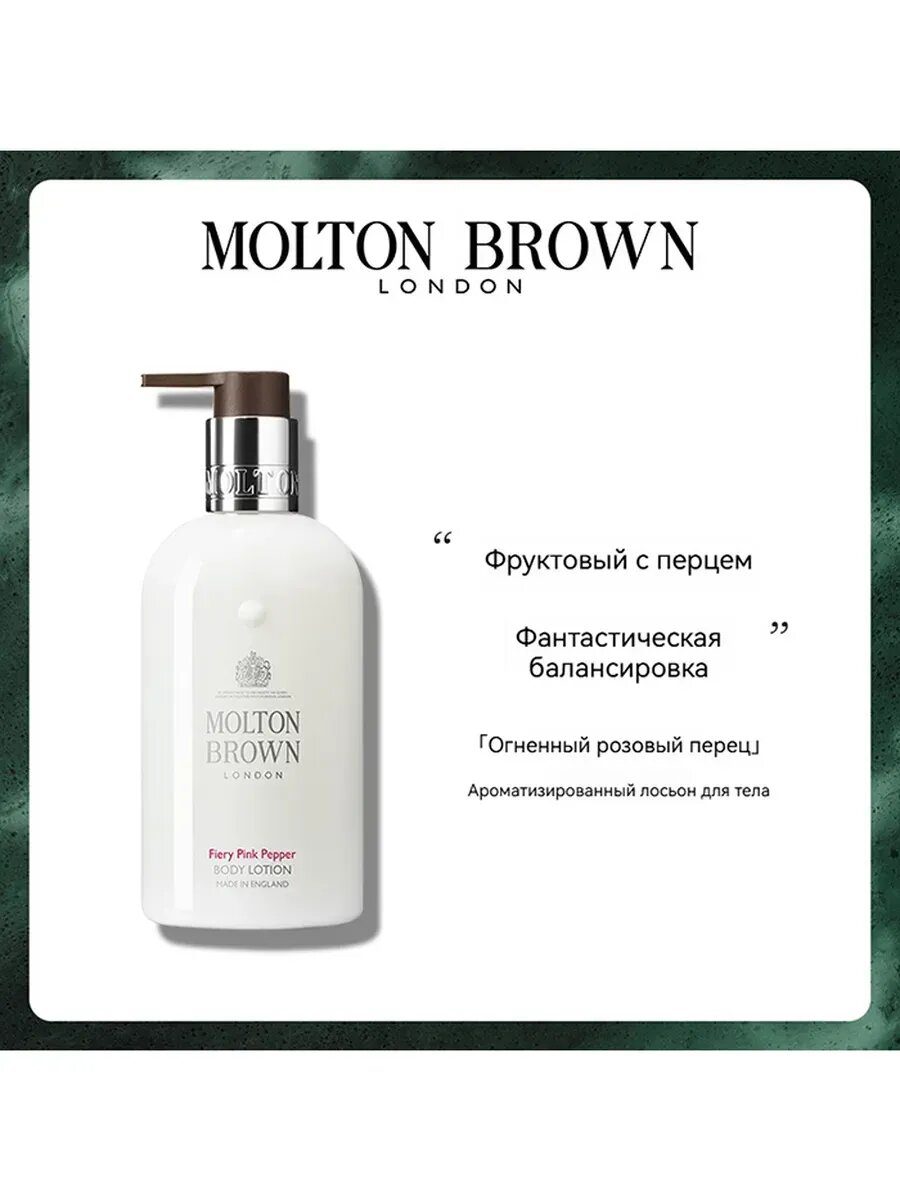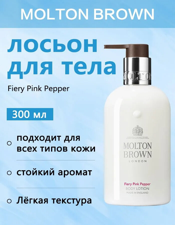 Лосьон для тела с бодрящим пряным запахом. Аромат Fiery Pink Pepper — бестселлер бренда Molton Brown, одинаково популярный как у женщин, так и у мужчин. В составе присутствует согревающее масло имбиря, которое тонизирует кожу. Лосьон обладает невесомой текстурой и быстро впитывается. Отлично увлажняет кожу, оставляя на ней легкий шлейфовый аромат. Один из самых стойких ароматов Molton Brown, остающийся на коже до 5 часов. Лосьон не оставляет на коже ощущение липкости. Верхняя нота — огненный розовый перец. Нота сердца — имбирь. Базовая нота — пачули. Способ применения: Нанесите нужное количество лосьона на кожу и равномерно распределите его. Подождите, пока лосьон впитается. Без парабенов, без глютена, продукция не тестируется на животных, подходит для веганов. Объём 300 мл Состав: Water / Aqua / Eau, Glycerin, Macadamia Ternifolia Seed Oil, C12-15 Alkyl Benzoate, Propylheptyl Caprylate, Butyrospermum Parkii (Shea) Butter, Ricinus Communis (Castor) Seed Oil / Ricinus Communis, Crambe Abyssinica Seed Oil, Cetearyl Alcohol, Fragrance / Parfum, Sodium Hyaluronate, Ethylhexylglycerin, Glycine Soja (Soybean) Oil, Isohexadecane, Copernicia Cerifera (Carnauba) Wax / Copernicia Cerifera Cera / Cire De Carnauba, Sodium Acrylate/Sodium Acryloyldimethyl Taurate Copolymer, Stearic Acid, Sorbitan Caprylate, Palmitic Acid, Glyceryl Stearate, Ceteareth-20, Xanthan Gum, Polysorbate 80, Hydrogenated Castor Oil, Sorbitan Oleate, Limonene, Butylphenyl Methylpropional, Hydroxycitronellal, Citral, Linalool, Tocopherol, Propanediol, Phenoxyethanol, Benzoic Acid, Sodium Hydroxide, Citric Acid.