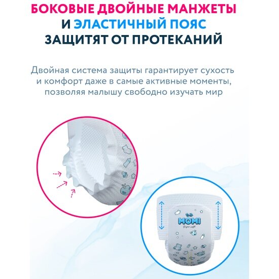 Ультрамягкие и легкие подгузники трусики для малышей MOMI Super Soft разработаны в Японии с использованием высококачественных материалов. Моми Super Soft - идеальное сочетание нежности и надежности, совмещая передовые технологии и качественные материалы, подгузники MOMI Super Soft созданы с целью сделать мир малышей мягким и защищенным. MOMI Super Soft спроектированы с максимальным вниманием к каждой детали. Ультрамягкий внутренний слой подгузников обеспечивает максимальный комфорт, а благодаря своей легкости, подгузники обеспечивают малышу полное ощущение свободы. Мягкость Super Soft - это не просто слова, а забота, которую можно ощутить прикосновением. Тонкий и легкий дизайн подгузников MOMI делает их идеальным выбором для активных малышей, которые постоянно в движении. Они позволяют ребенку ползать, стоять и бегать, не мешая ему наслаждаться окружающим миром. Одним из ключевых преимуществ этих подгузников является их уникальная способность мгновенно и эффективно впитывать влагу, обеспечивая надежную защиту на протяжении длительного времени. Благодаря инновационным технологиям и усовершенствованной конструкции, подгузники эффективно удерживают жидкость, обеспечивая длительное ощущение сухости и комфорта для вашего ребенка. Уникальный супер-дышащий слой распределяет влагу равномерно, а оборочки вокруг ножек предотвращают протекание. Индикатор наполнения поможет вам определить, когда пришло время сменить трусики. Супер-мягкий эластичный поясок обеспечивает идеальную посадку и свободу движений. Ультратонкий дизайн подгузников MOMI Super Soft делает их незаметными под одеждой. MOMI Super Soft предназначены для максимальной безопасности и удобства малыша. Они не только защищают его от протеканий, но и дарят ощущение легкости, что особенно важно для его активного развития. MOMI придерживается принципа использования только самых качественных материалов для производства подгузников. Это обеспечивает нежность и мягкость для чувствительной кожи малышей, минимизируя риск раздражений и аллергических реакций. Каждый этап производства тщательно контролируется, чтобы гарантировать безопасность и надежность продукции. Инновационный дизайн подгузников Momi обеспечивает оптимальную посадку и свободу движений ребенка. Трусики Super Soft обеспечивают идеальное прилегание и предотвращают протекания. Трусики MOMI Super Soft доступны в размерах M, L, XL, XXL. Бренд Momi стремится создать продукты, которые не только обеспечивают комфорт, но и сохраняют окружающую среду. Подгузники Momi производятся с соблюдением принципов экологической ответственности, чтобы минимизировать негативное воздействие на природу. Momi - это бренд, который объединяет японскую технологию, качество и любовь к малышам. Momi Super Soft это не только подгузники, но и символ заботы о самом драгоценном моменте в жизни Вашего ребенка - детстве.
