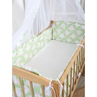 Комплект бортиков "Зайка гномик" выполнен в приятных зеленых и розовых тонах, что делает его милым и стильным аксессуаром для детской комнаты.