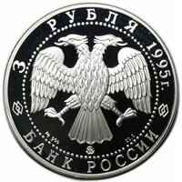 Сохранность: PROOF Год: 1995 Металл: Серебро Номинал: 3 рубля Тематика: Юбилейные Упаковка: Капсула для монеты Состояние поля: Незначительные следы неправильного хранения - несколько слабозаметных микроцарапинок на поле монеты. Комплектация: Сертификат ЦБ РФ для 3 рублей Проба: 900/1000 Тираж, шт: 30000 Гурт: 300 рифлений. Краузе #: Y445 ЦБ РФ #: 5111-0027 Диаметр, мм: 39 Толщина, мм: 3,3 Художник: А. А Колодкин. Вес, г: 34.88(±0.32) Вес химически чистого металла, г: 31,39 Страна: Российская Федерация Монетный двор: Московский (ММД)