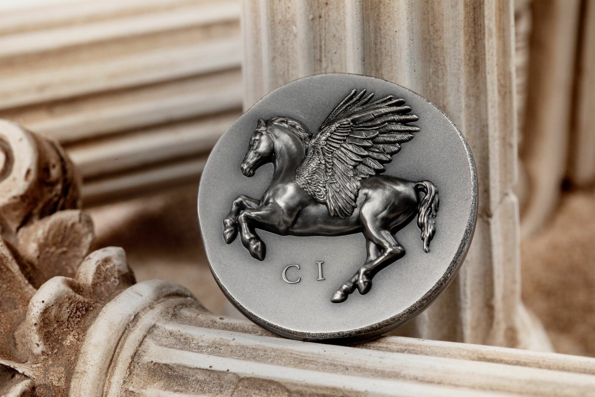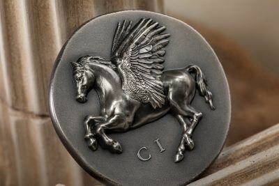 Эта красивая серебряная монета весом в 1 унцию представляет собой новый выпуск серии «Нумизматические иконы». На ней изображено одно из самых известных существ греческой мифологии: Пегас. Монета имеет качество античной отделки, сверхвысокий рельеф Smartminting и поставляется в футляре вместе с сертификатом подлинности. Ограниченный тираж 999 штук по всему миру!