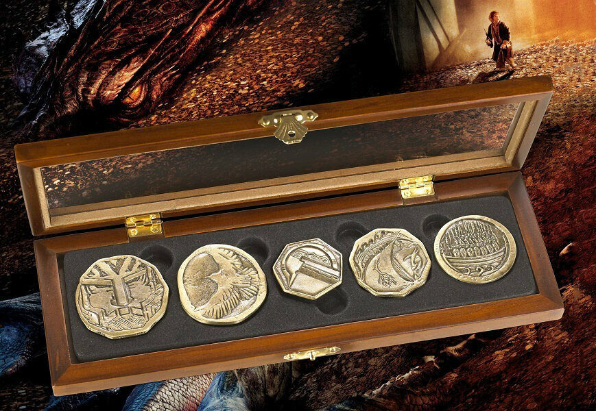 Набор монет из несметного сокровища Смауга, скрытого в недрах Одинокой Горы. В набор входят 5 металлических монет с объемной гравировкой на каждой из сторон. Товар поставляется в коллекционном деревянном дисплее.