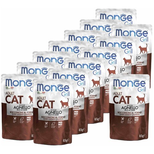 Monge (Монж) Cat Grill полнорационные беззерновые паучи из новозеландского ягненка для взрослых кошек и котов 85г. Нежные кусочки в аппетитном желе из отборных ингредиентов высокого качества с добавлением свежего мяса ягнёнка для взрослых кошек. Кусочки, приготовленные по итальянскому рецепту, запекаются по инновационной технологии в печи, что обеспечивает высокую вкусовую привлекательность для Вашего питомца. Корм содержит в себе все необходимые витамины, аминокислоты, минералы и является полнорационным. Не содержит злаков, красителей и консервантов. Сделано в Италии. Сочетание влажного корма с сухим регулирует водный баланс организма, что особенно важно для кошек, которые пьют мало воды.