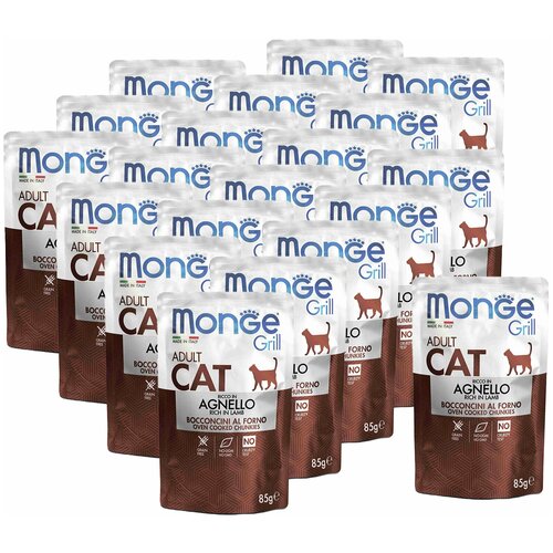 Monge (Монж) Cat Grill полнорационные беззерновые паучи из новозеландского ягненка для взрослых кошек и котов 85г. Нежные кусочки в аппетитном желе из отборных ингредиентов высокого качества с добавлением свежего мяса ягнёнка для взрослых кошек. Кусочки, приготовленные по итальянскому рецепту, запекаются по инновационной технологии в печи, что обеспечивает высокую вкусовую привлекательность для Вашего питомца. Корм содержит в себе все необходимые витамины, аминокислоты, минералы и является полнорационным. Не содержит злаков, красителей и консервантов. Сделано в Италии. Сочетание влажного корма с сухим регулирует водный баланс организма, что особенно важно для кошек, которые пьют мало воды.