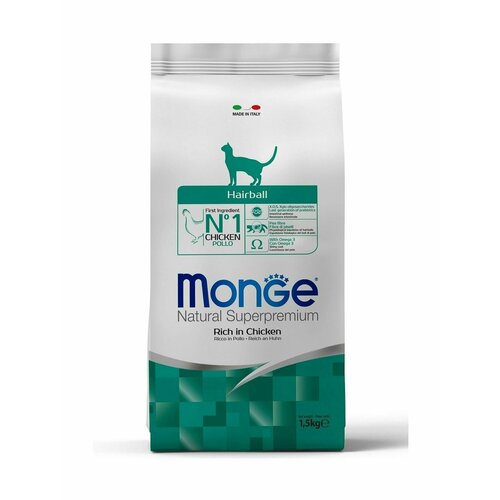 Monge Superpremium Cat Hairball - это полноценный сбалансированный рацион для взрослых домашних кошек, часто страдающих от скопления комков шерсти в желудке. Высокий уровень белка в составе корма и содержание в нем L-карнитина позволяют кошке долгие годы сохранять активность и хорошую физическую форму.