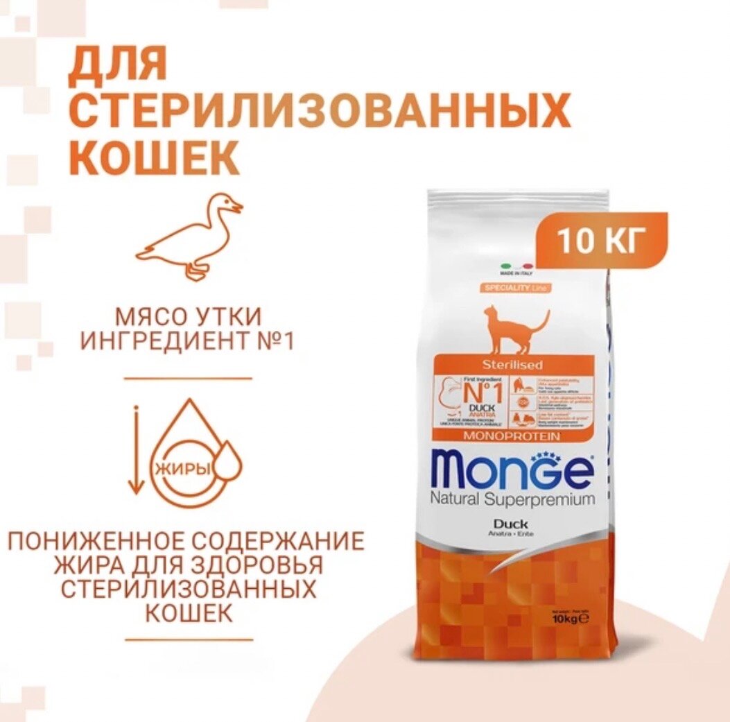Monge (Монж) Cat Speciality Line Monoprotein сухой корм из мяса утки для стерилизованных кошек и кастрированных котов 1,5 кг.