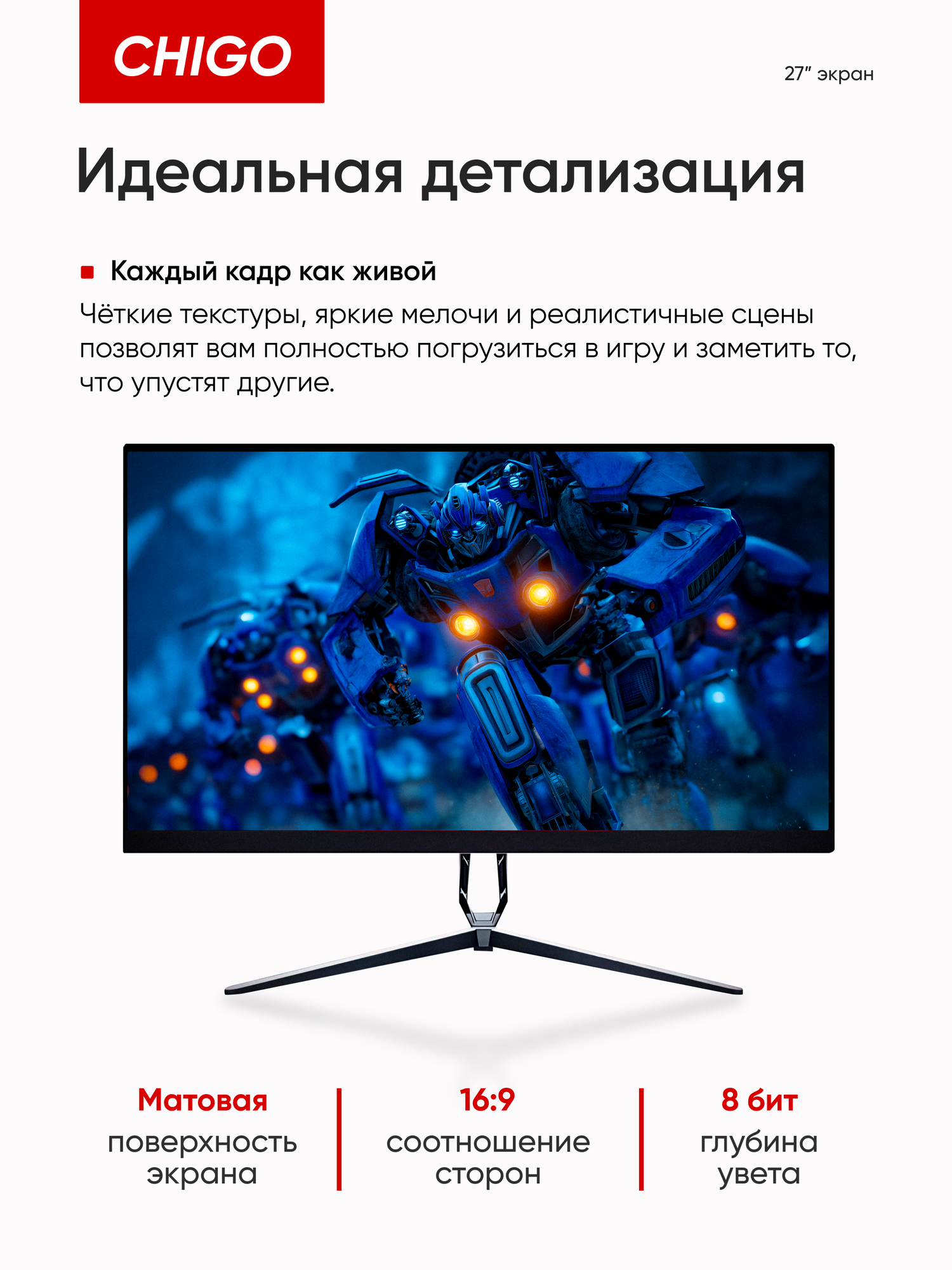 С 27-дюймовым экраном и разрешением 1920*1080, монитор Chigo обеспечивает детализированное изображение, позволяя Вам наслаждаться просмотром фильмов, видео и игр в высоком качестве. Каждый кадр выглядит ярко и четко, что делает ваш опыт более увлекательным.