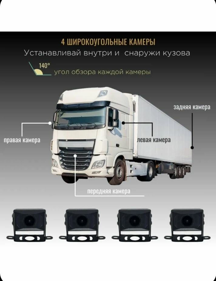 - 4 камеры - для установки слева, справа, спереди и сзади автомобиля (можно настроить парковочные полосы на каждой из них)
