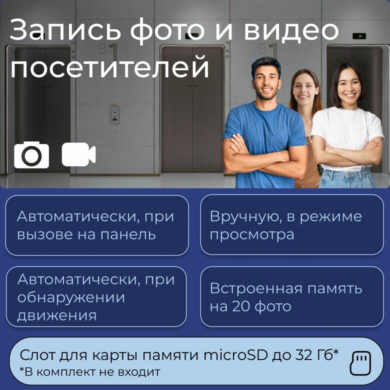 Встроенные функции автоответчика, внутренняя память на 20 фотографий и поддержка карт памяти до 32 ГБ позволяют сохранять важную информацию и медиафайлы. Воспроизведение аудиофайлов в формате mp3 и видеофайлов в формате mp4 или avi расширяет возможности использования домофона.