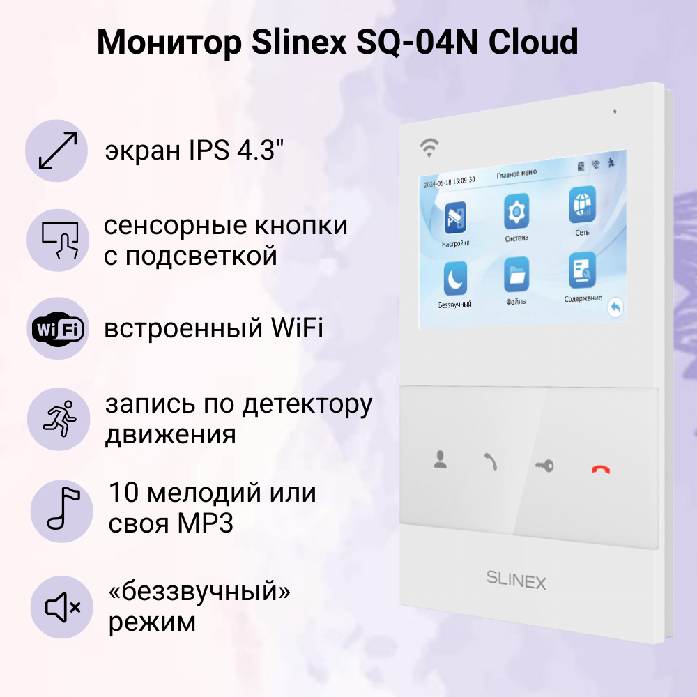 Компактный цветной видеодомофон без трубки с 4.3" экраном, встроенный WiFi, переадресация вызова на смартфон, программный детектор движения (запись начинается при появлении движения в кадре), встроенный блок питания, ширина корпуса 119 мм.