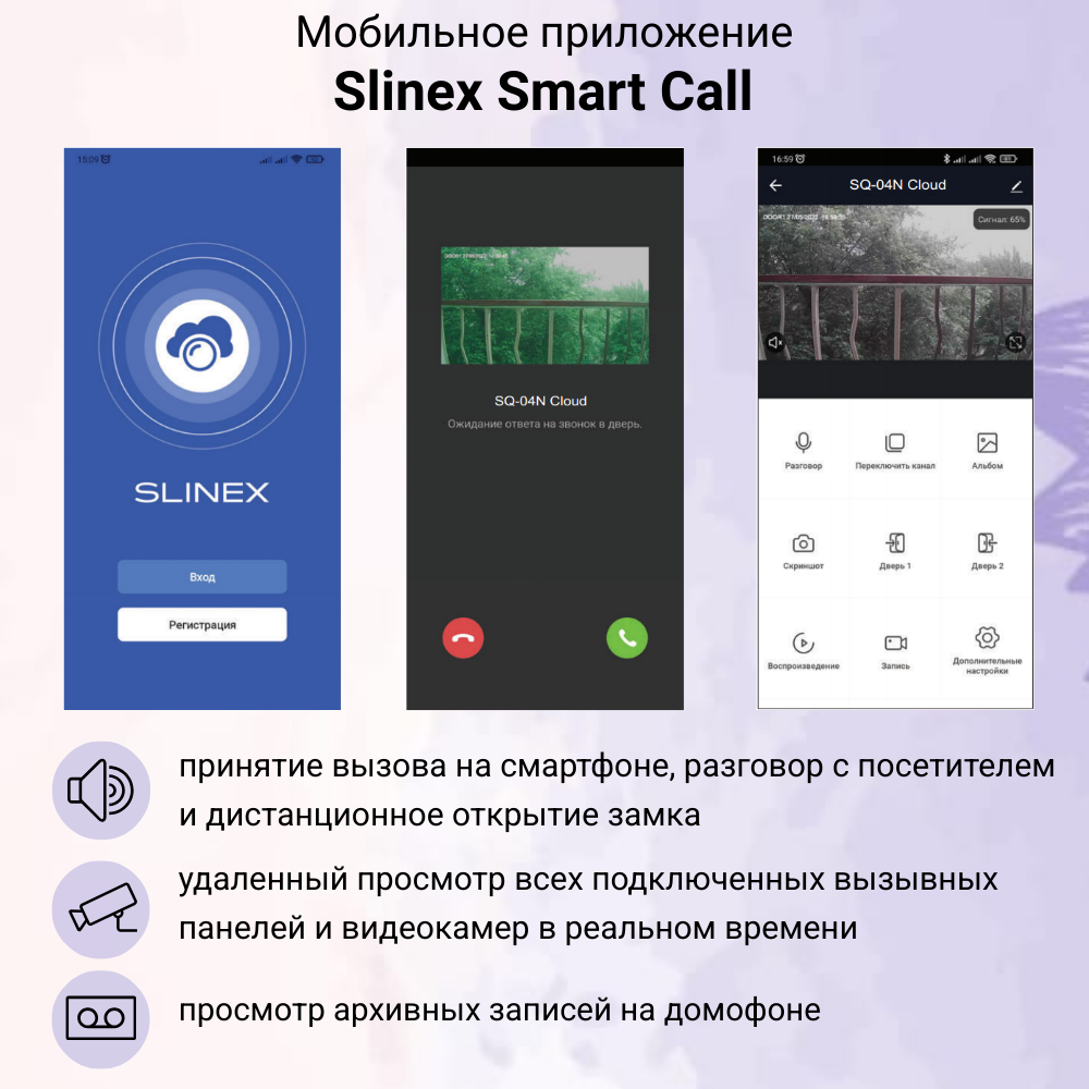 Просмотр видео в реальном времени с любой видеопанели или видеокамеры как при вызове, так и по кнопке просмотра. Принятие вызова и двухсторонний разговор с посетителем на самом мониторе или удаленно через мобильное приложение Slinex Smart Call. Дистанционное управление электрическим замком через реле вызывной панели. Режим «не беспокоить». Автоответчик. Часы в режиме ожидания. Отключение подсветки кнопки на вызывной панели.
