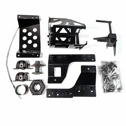 Кронштейн в любых режимах и нагрузках удерживает два агрегата (КПП и РК) в точном, неизменном положении относительно друг друга. Бесшарнирный промвал из комплекта, как и родной промвал с шарниром, передает вращение от КПП на РК, но при этом нет потерь энергии. Опоры РК воспринимают на себя возросший вес всего агрегата, так как опора КПП в данном случае упраздняется. При этом конструкция опор такова, что они способны гасить вибрацию, которая приходит от силового агрегата. Усилители крепления опор воспринимают на себя возросшую нагрузку от агрегата и распределяют ее по днищу кузова, при этом являясь и усилителем пола автомобиля.