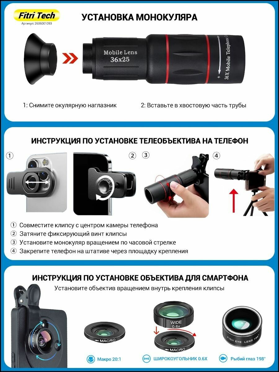 Купить Монокуляр 36X HD BAK-4 + Комплект 3 Объективов (Широкий Угол/Макро/Рыбий Глаз) с Креплением для Телефона и Треногой — Для Охоты, Рыбалки, Концертов с доставкой по всей России.