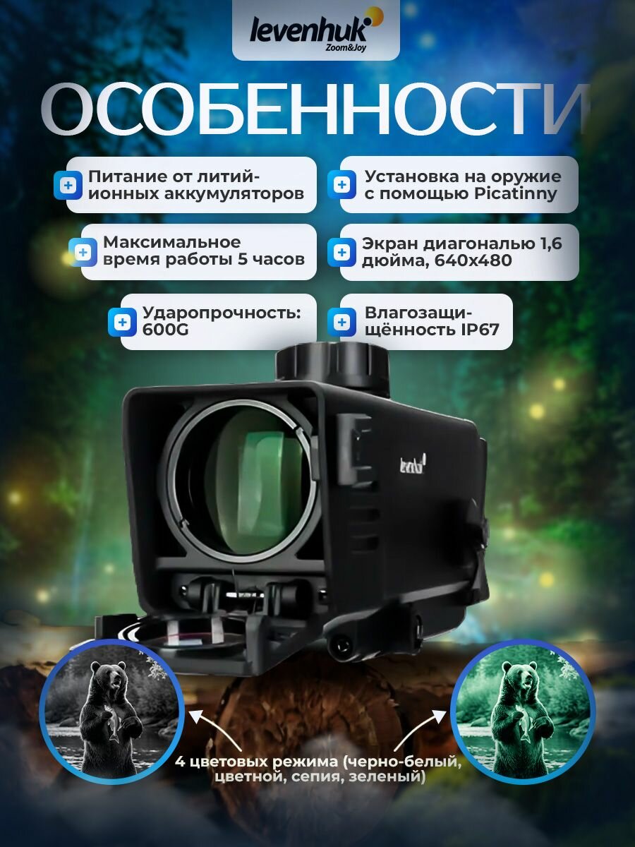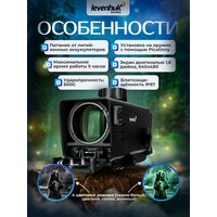 Для удобства и большей эффективности во время охоты Levenhuk Halo NVR50 устанавливается на оружие с помощью крепления Picatinny. К нему крепится инфракрасный фонарик. Функция вычисления баллистических данных поможет сделать максимально точный и успешный выстрел. Прибор подходит для гладкоствольного и нарезного огнестрельного оружия.