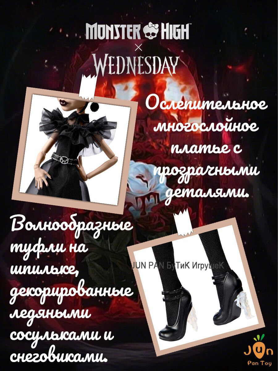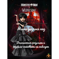 Коллекция Monster High Wednesday — это дань уважения культовому сериалу с его мрачным юмором, готической эстетикой и незабываемыми персонажами. Вас ждут куски, которые сочетают в себе жутковатый шарм и изысканную детализацию — идеально для настоящих ценителей!