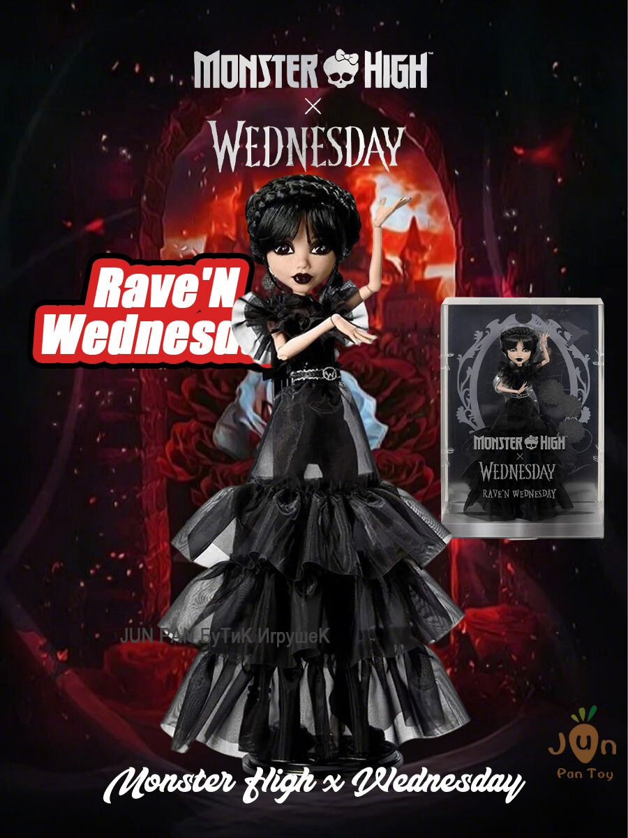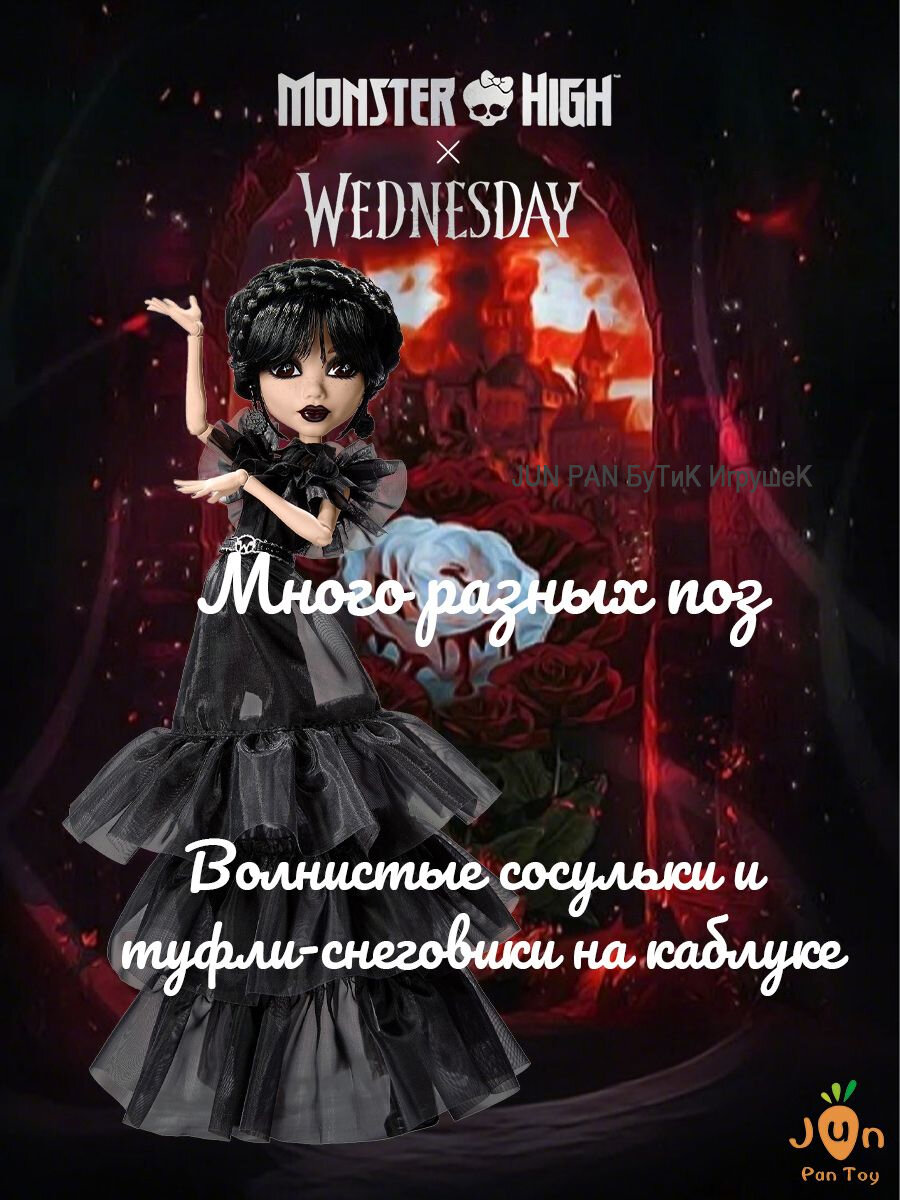 Представляем куклу Рэйвен Уэнсдей — ту самую, что покорила сердца миллионов своим сарказмом и стилем. Эта модель вдохновлена знаменитой сценой школьного танца в сериале. Её полуночно-чёрное платье из слоёной органзы словно соткано из теней и тайн, а силуэт подчёркнут эффектным поясом и серьгами Monster High. Это не просто наряд — это заявление!