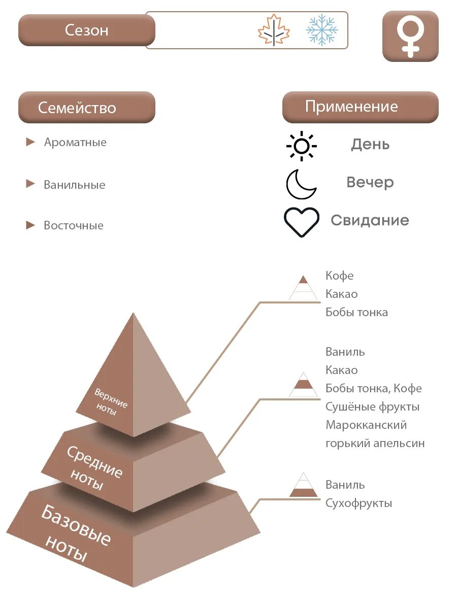 Этот парфюм открывается насыщенными нотами бобов тонка, кофе и какао, создавая впечатление свежеприготовленного горячего шоколада. В сердце раскрывается сочетание ванили, сушёных фруктов и марокканского горького апельсина, которые добавляют аромату изысканности и лёгкой пикантности. Завершает композицию мягкая база из ванили и сухофруктов, оставляющая за собой уютный и обволакивающий шлейф.