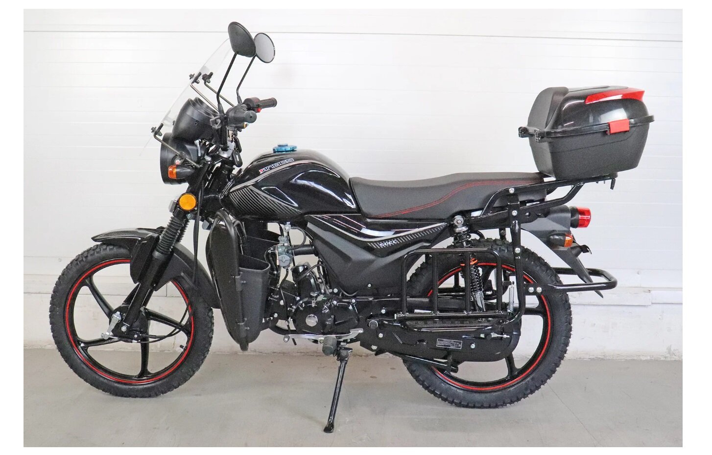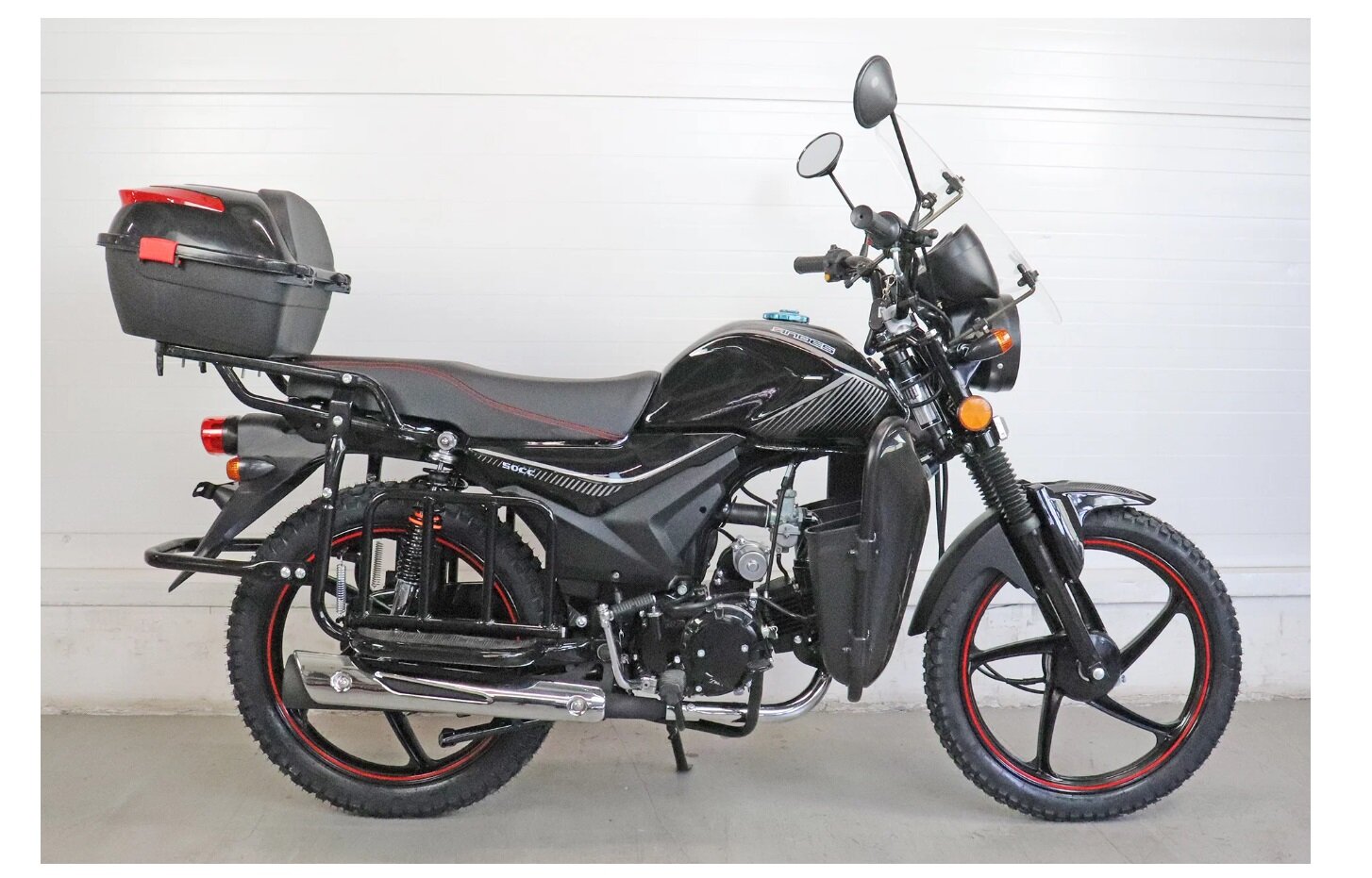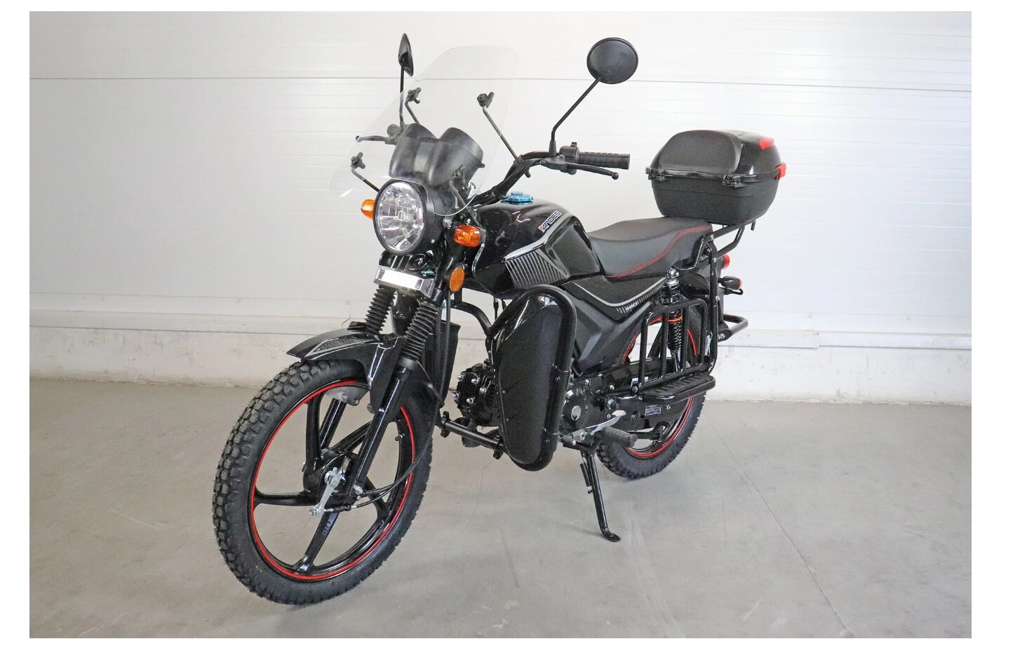 Мопед Alpha ANDES люкс (Тюнинг)(сигн. с автозап, ветр. стекло, защита ног с карманами, подставка для ног, багажник, пласт. кофр, литые диски) черный глянцевый