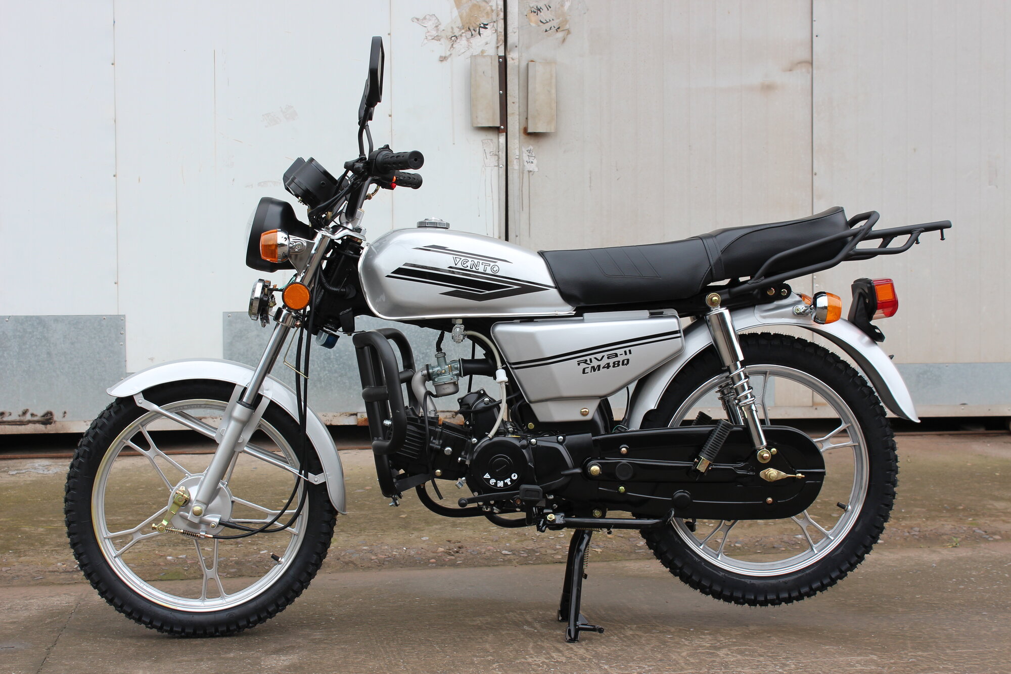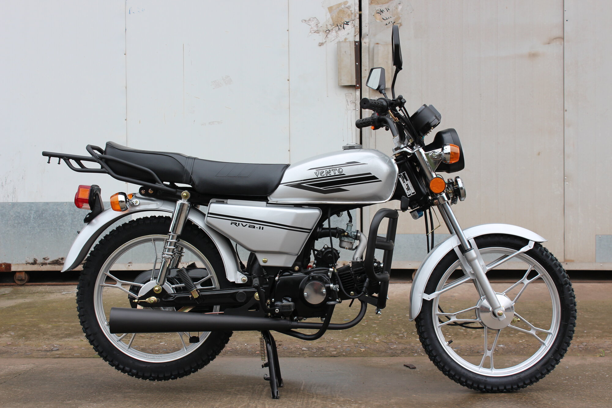 Самый доступный, классический мопед VENTO RIVA II Classic имеет объем двигателя 110 см2, с маркировкой 49,9 кубов не подлежит регистрации. Спортивный дизайн, внедорожная резина, небольшой расход топлива.