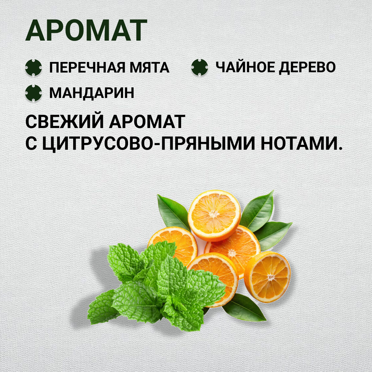 - Аромат - перечная мята, мандарин, чайное дерево - cвежий аромат с цитрусово-пряными нотами. Бодрящая перечная мята сочетается с кисло-сладким мандарином и терпко-горьковатым чайным деревом;