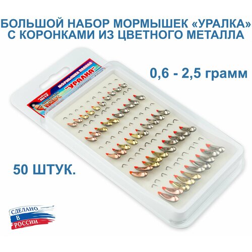 По многочисленным просьбам наших покупателей, изготовили большой набор мормышек "Уралка". Содержит 50 паяных мормышек различных весов. Для изготовления коронки применяются цветные металлы: нейзильбер, латунь и медь. Для большей заметности, на каждую мормышку нанесена яркая красная точка и защитный лак. Мормышки с коронками имеют отличный внешний вид и одинаково хорошо приманивают как хищника, так и мирную рыбу. Применять данные мормышки можно как в безнасадной ловле "на игру", так и с использованием дополнительной приманки. Для удобства ознакомления с набором, собрали все характеристики мормышек на одном из изображений.