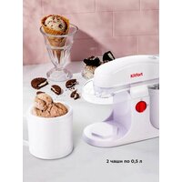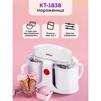 Лучший домашний десерт! Полуавтоматическая мороженица КТ-1838 поможет вам приготовить настоящее мороженое из натуральных продуктов, а также сорбет, джелато и замороженный йогурт. 3 простых шага – мороженое готово Поместите чистые сухие чаши в морозильную камеру с температурой примерно -18°C на 8-12 часов для замерзания хладагента в чашах. После этого подготовьте смесь для мороженого, залейте её в ёмкости и установите в прибор. Через 20-30 минут мороженое готово! Простое управление Переключатель питания включает и выключает устройство. Поверните регулятор по часовой стрелке, чтобы зафиксировать чаши в углублениях на базе, и против часовой стрелки – чтобы снять их. Можно приготовить 1 или 2 порции мороженого Вы можете использовать только одну чашу для приготовления мороженого. В этом случае не устанавливайте вторую смешивающую лопасть. Ёмкость каждого резервуара 0,5 литра. Удобство в деталях Крышка мороженицы изготовлена из прозрачного пластика, благодаря чему можно наблюдать за процессом приготовления мороженого. Для удобства добавления ингредиентов в процессе приготовления есть загрузочные отверстия. Один прибор – сотня десертов Благодаря КТ-1838 вы можете приготовить мороженое совершенно на любой вкус: экспериментировать с рецептами, начинками и добавками. С таким прибором вы точно найдёте свой идеальный вкус! Удобно мыть! Перед очисткой отключите прибор и подождите 20-40 минут для выравнивания её температуры. Конструкция прибора является полностью разборной, что позволяет легко очищать все её части.