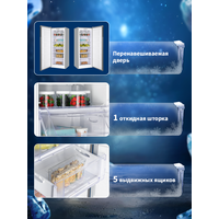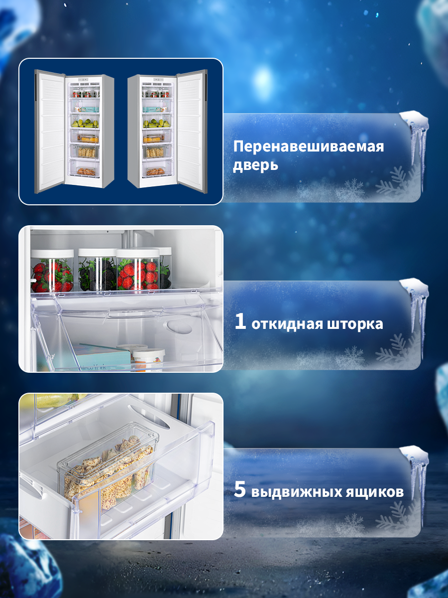| Дополнительная информация | Морозильник имеет 5 выдвижных прозрачных ящиков и 1 отделение с откидной шторкой для размещения продуктов, а также форму для льда, Панель управления модели расположена внутри камеры, механический термостат |