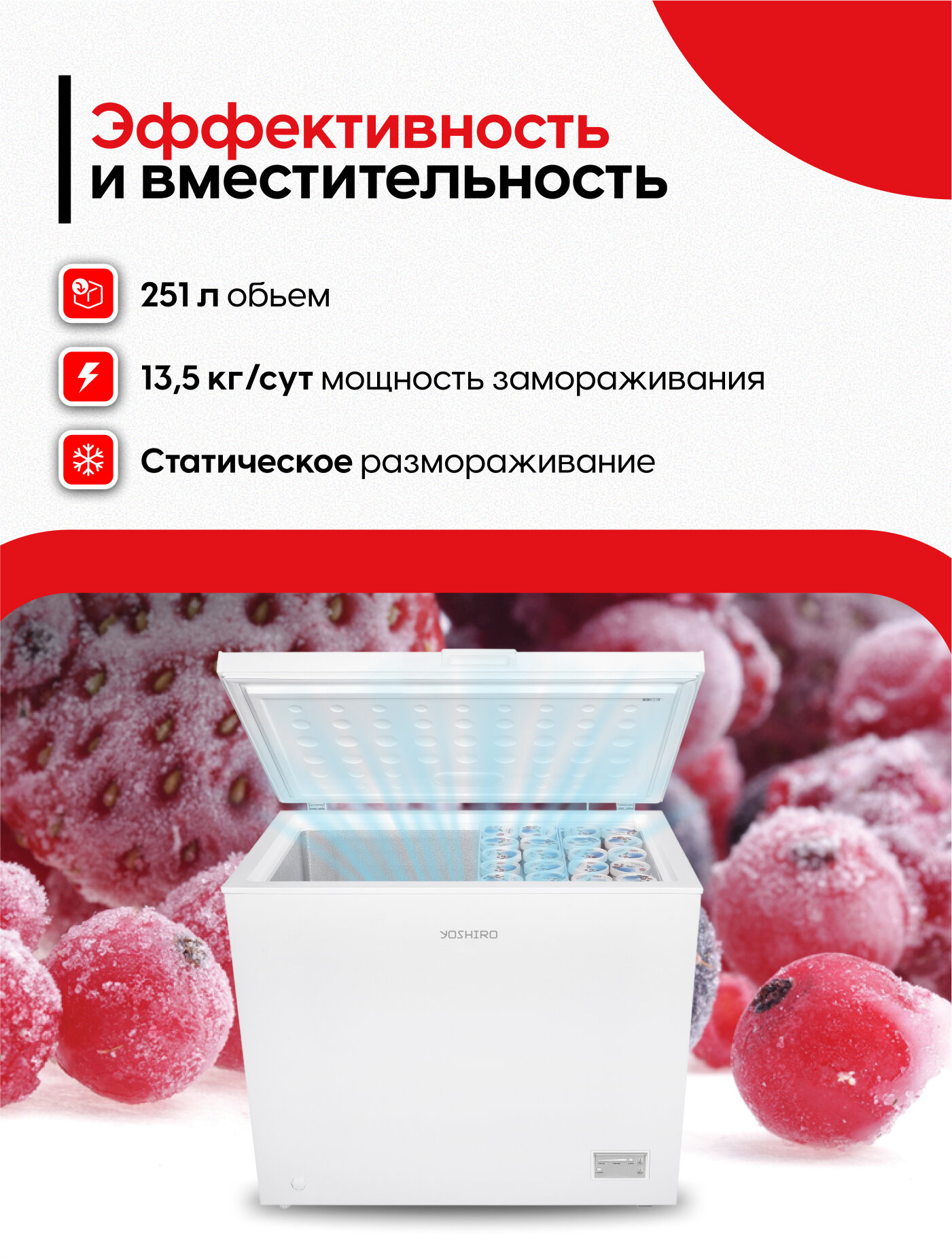 Купить Морозильный ларь для дома YOSHIRO YFR-U120W 251 л, заморозка 13.5 кг/сутки, сохранение холода 36 часов с доставкой по всей России.
